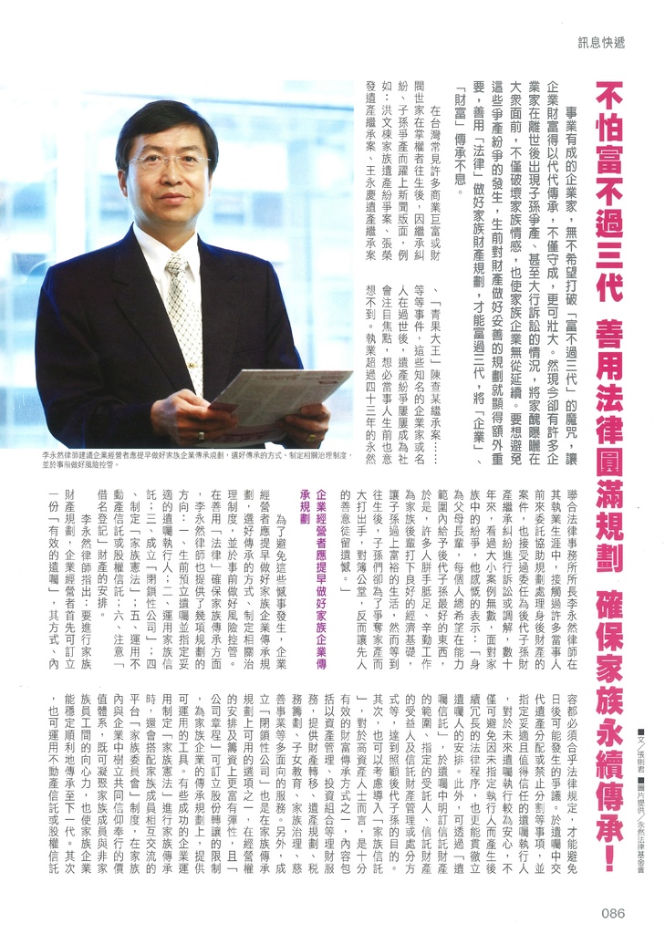 事業有成的企業家,無不希望打破「富不過三代」的魔咒,讓企業財富得以代代傳承,不僅守成,更可壯大。然現今卻有許多企業家在離世後出現子孫爭產、甚至大行訴訟的情況,將家醜曝曬在大眾面前,不僅破壞家族情感,也使家族企業無從延續。要想避免這些爭產紛爭的發生,生前對財產做好妥善的規劃就顯得額外重要,善用「法律」做好家族財產規劃,才能富過三代,將「企業」、「財富」傳承不息。