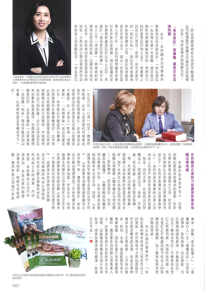 有鑑於愈來愈多名人、企業家開始重視家族傳承的重要,對於法律的專業知識需求孔急,於是李永然律師在永然聯合法律事務所內成立了「永然家族傳承法律事務中心」,由所內資深專業的法律人及地政士為客戶提供各項財產的規劃,包含:信託法律、公益信託及財團法人、閉鎖型公司、保險、不動產、借名財產、財產分割及移轉……等,希望藉由法律專業的規劃,協助個人或家族對於財產妥適的安排。旗下永然文化出版公司也出版相關法律圖書《繼承權益法律指標——家族傳承.借名登記.信託.繼承與遺囑》、《繼承權益與繼承司法實務》等等,永然法律基金會則捐贈多本法律手冊,包括:《家族傳承與不動產借名登記法律手冊》、《家族傳承規劃與遺產繼承法律手冊》等,讀者反應熱烈,紛紛表示藉由閱讀增加了許多有關家族傳承的法律知識,於是此次,特別邀請永然聯合法律事務所台北所主任律師黃斐旻律師規劃《家族傳承、不動產信託與借名登記法律手冊》。並請李永然律師及永然聯合法律事務所內多位律師與永然地政士聯合事務所李廷鈞地政士共同執筆,內容包括:家族傳承之公司治理原則、家族企業的經營與傳承規劃、閉鎖性章程規劃、應用家族治理進行家族傳承、規劃「意定監護人」、「遺囑執行人」及「遺囑信託」完善家族傳承、節稅規劃、信託規劃、信託態樣與課稅原則、不動產信託,以及了解借名登記、不動產借名登記之稅務問題、消滅時效問題、借名登記之不動產回復予借名人的移轉登記等議題,為了解家族傳承提供極佳管道。